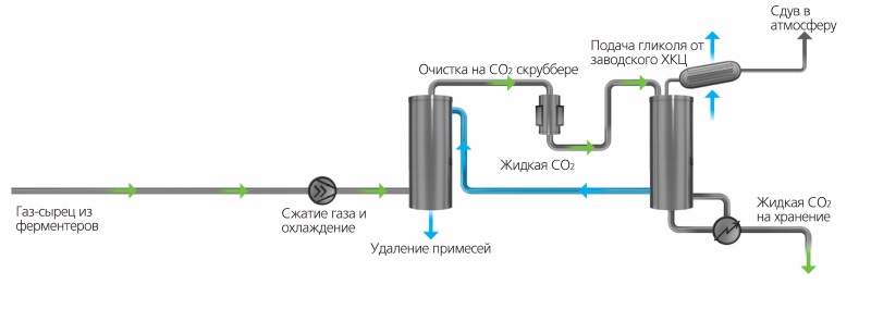 Перед конденсацией СО2 из нее удаляется вся влага. Осушенная газообразная CO2 затем сжижается в конденсаторе CO2 с использованием гликоля (-4°C) в качестве охлаждающего агента. Сжиженная CO2 в конечном счете очищается на дистилляционной колонне удаляя кислород до остаточного содержания последнего < 3 ppm.