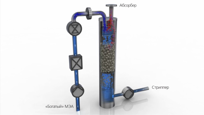 поднимаясь по которой вступает во взаимодействие во встречном потоке со стекающим с верхней части колонны раствором МЭА, который поглощает CO2.