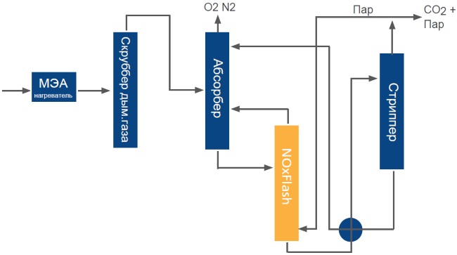 Еще одним достоинством NOxFlash процесса является его комбинирование с дистилляционной колонной PUR, оптимизирующее выход наивысшей чистоты продукта СО2 с минимальным содержанием инертов, ароматических углеводородов и окислов азота NOx.