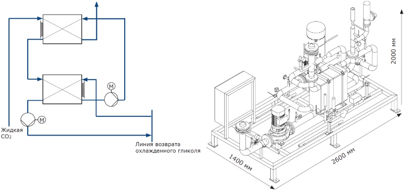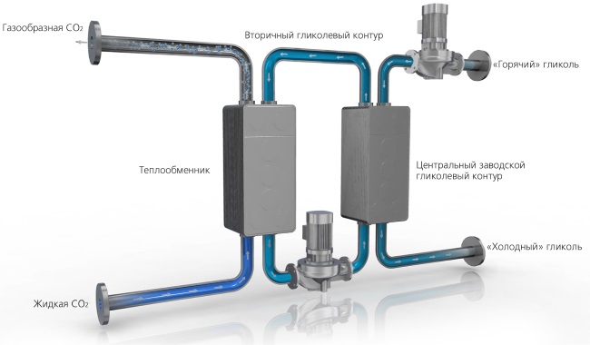 Инновационный комплекс с теплообменниками ReVap, использует холод жидкой CO2 для охлаждения гликоля. Происходит отдача тепла от гликоля жидкой CO2, повышая тем самым ее температуру до точки испарения. С этого момента мы получаем газообразную CO2, которую можно направлять к потребителю.