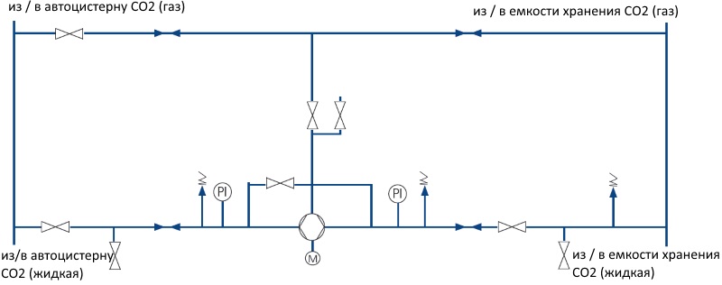 Узел заправки автоцистерн предназначен для перекачки жидкой СО2 из/в емкости хранения.